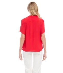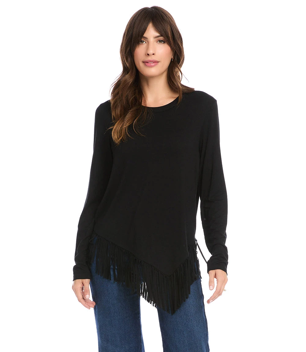 Swishy fringe details the hem of this super soft top cut from jersey-knit. This top can easily transition from desk to dinner with a simple switch of shoes and accessories.