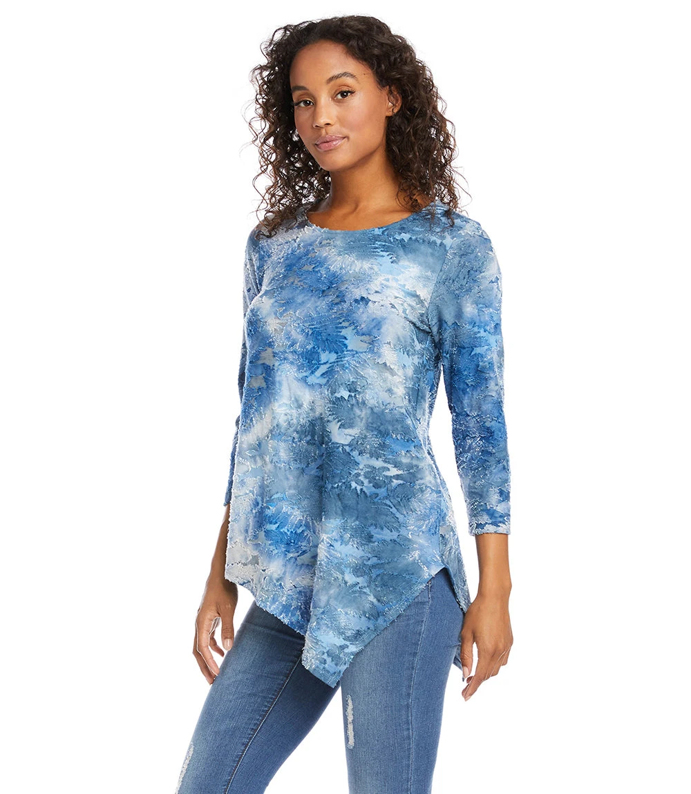 Textural beauty is found in this jacquard top covered in an alluring leaf tie-dye design. Its asymmetric hem makes this perfect for layering. It pairs perfectly with your favorite denim. It