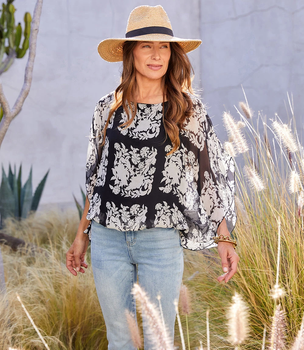 A sheer overlay adds soft movement to this scarf top detailed with a charming floral paisley print. It pairs perfectly with your favorite denim. This generously sized top is lined with stretch jersey knit.