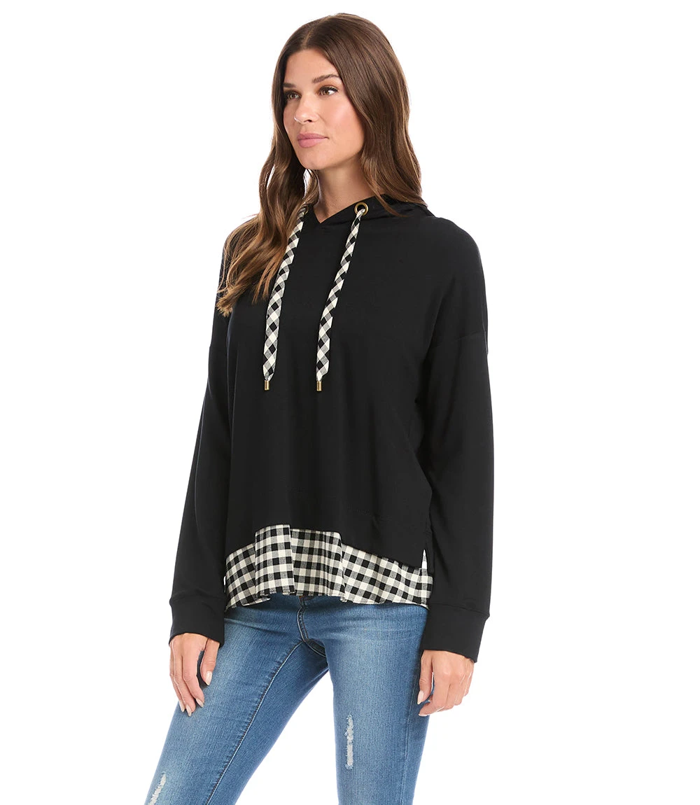 Indulge in the buttery-softness of this French Terry hoodie finished with a contrast gingham pattern hem. This hoodie is perfect for running errands and athleisure activities.