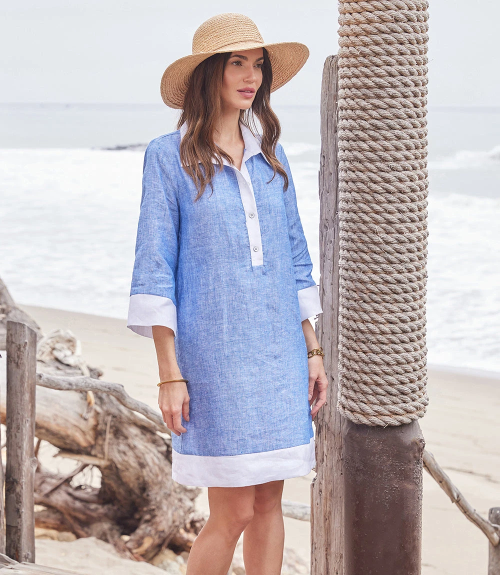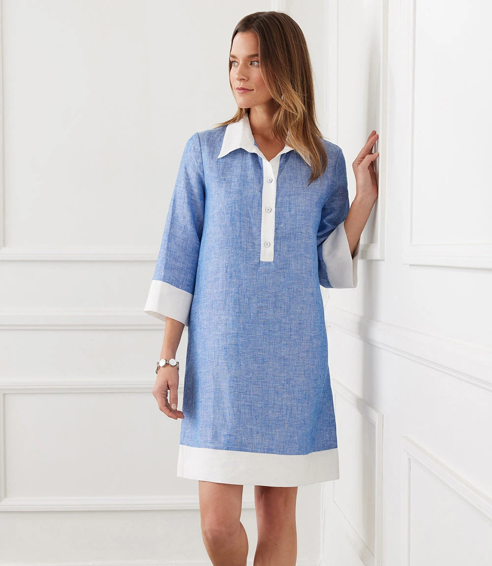 This collared dress is perfect for easy, understated style. With lightweight linen and contrasting placket, sleeve, and hem detailing, it’s the perfect option for any warm day.