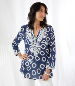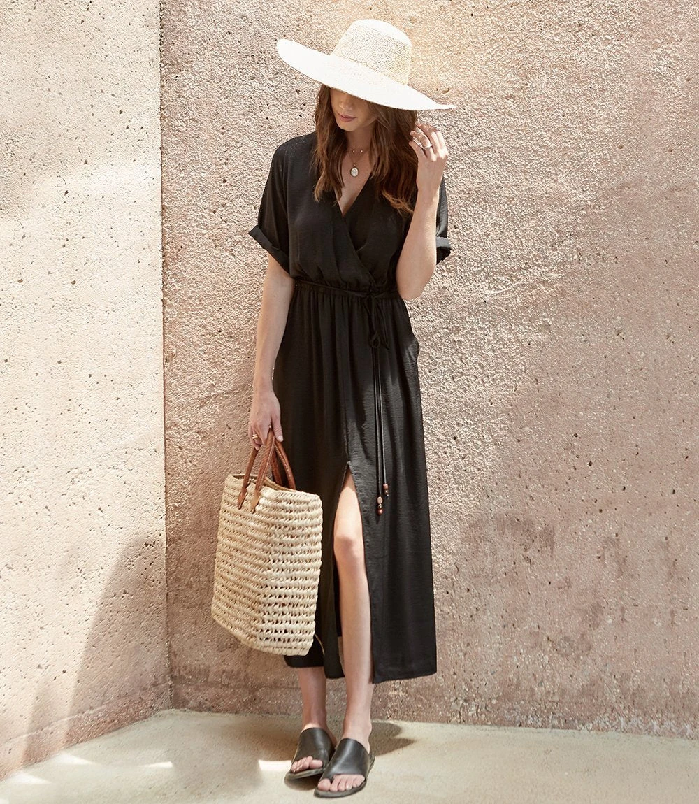 Indulgently smooth, this breezy dress features extended roll sleeves and a front-slit hem. Cinched at the waist for a uniquely tailored look. Belted tie includes wood and resin tiger’s eye beads.