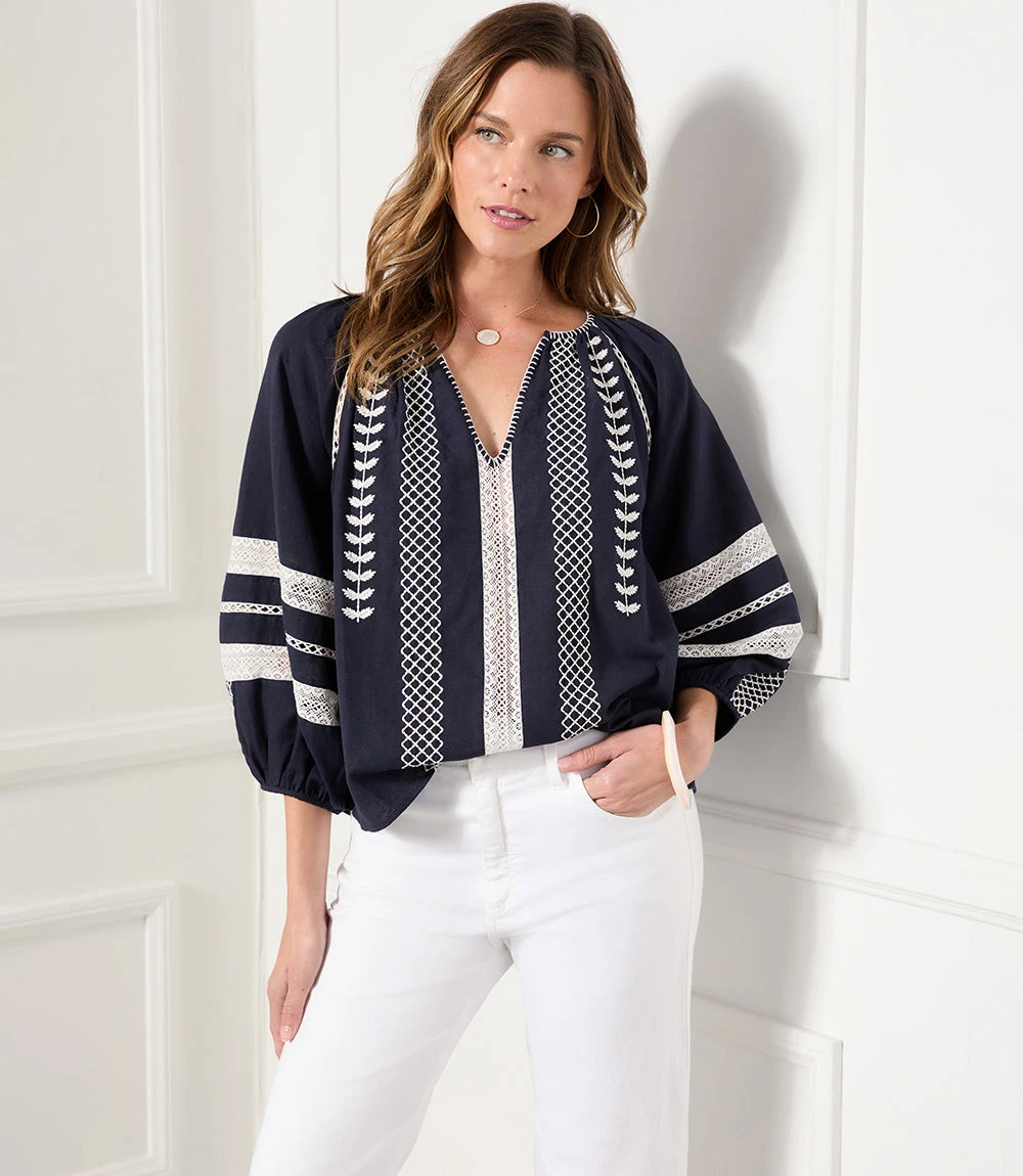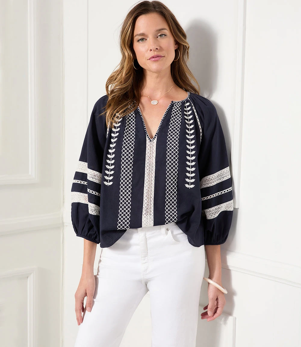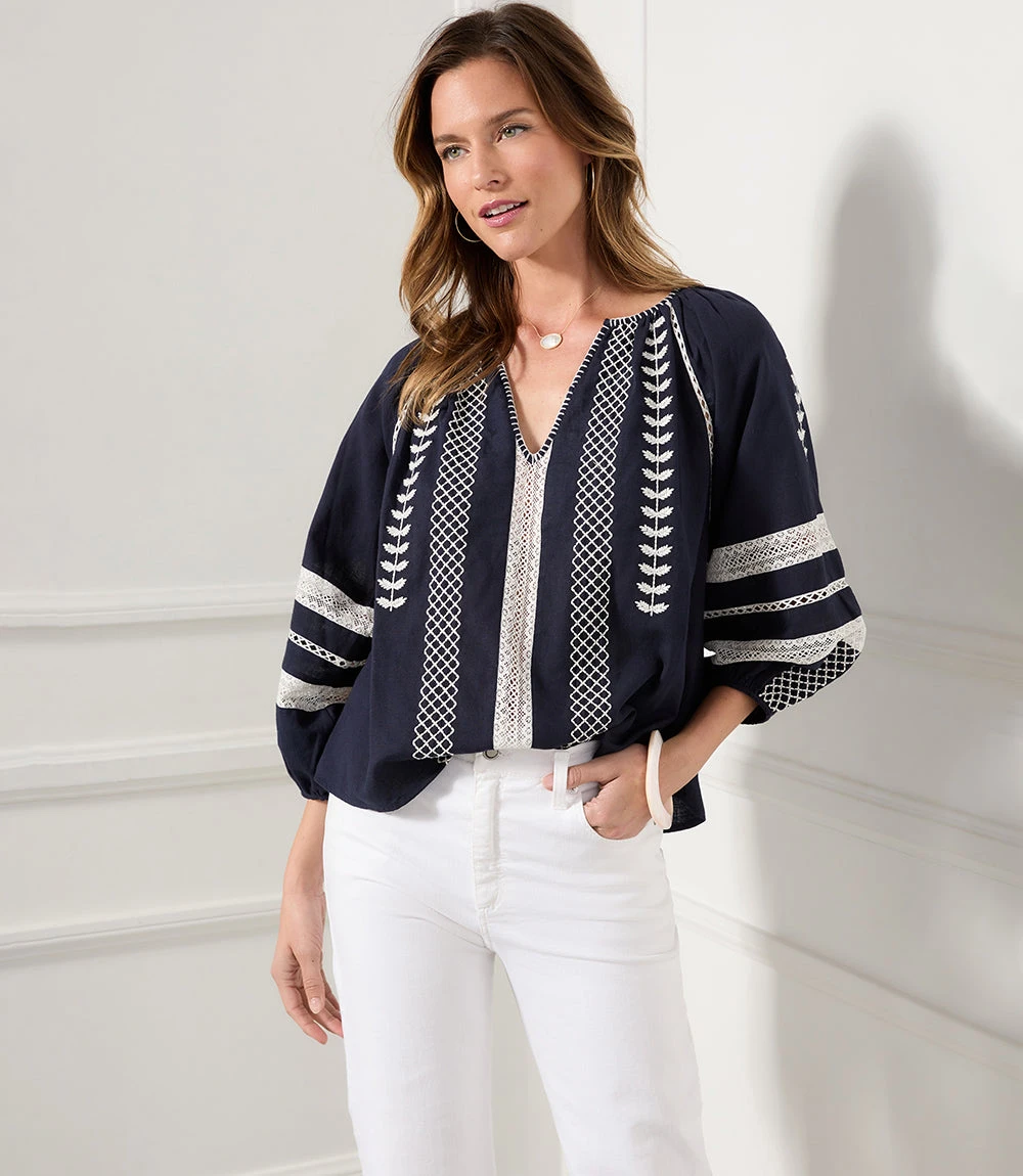 Airy cotton gives a breezy feel to this peasant top detailed with intricate embroidery. Pair it with white pants or shorts for a fresh, Summer-ready look.