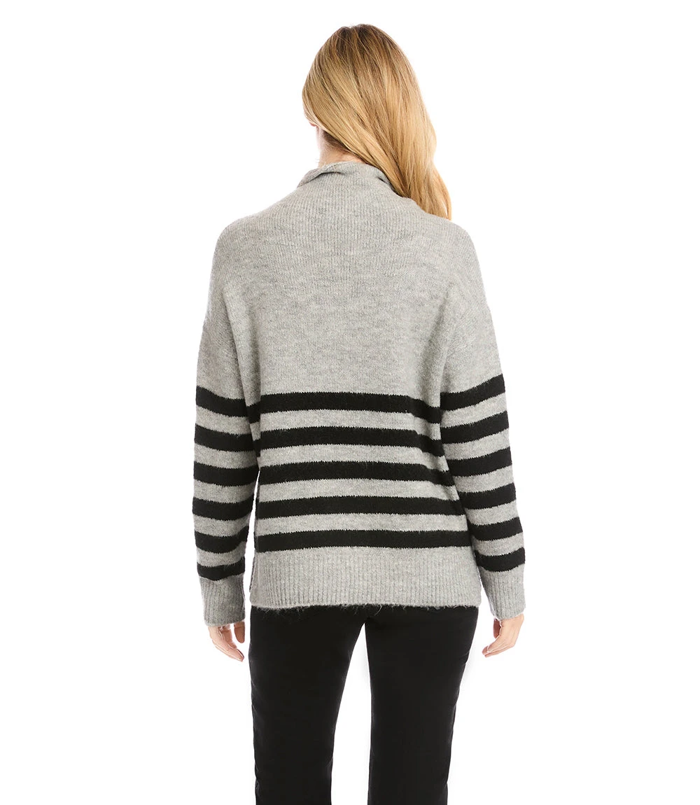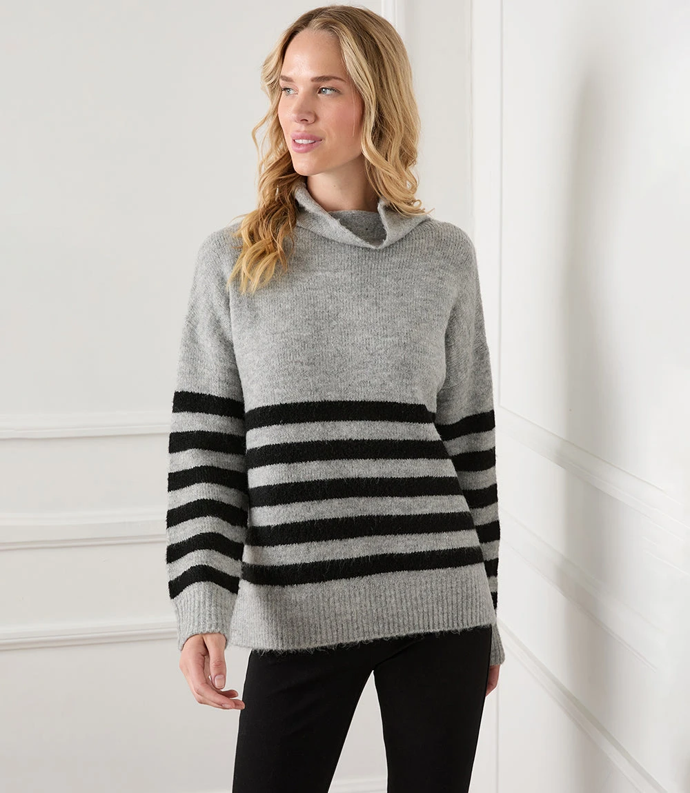 Crafted from super soft plush knit, this essential sweater is detailed with a cozy mock neck and classic stripes. This sweater is a layering essential for the cooler temperatures ahead.