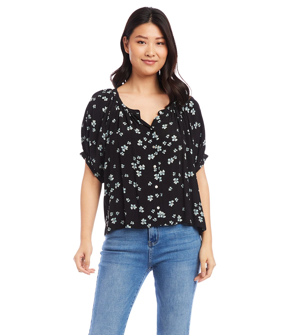 Puff sleeves and a button-front silhouette lend feminine flair to this breezy top. Pair it with shorts, high-waisted jeans, or black pants- the outfit possibilities are endless.