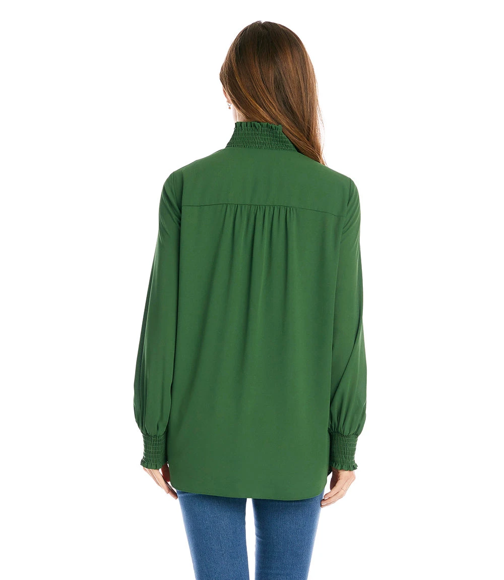 Add a dash of old-world romance to your wardrobe with billowy smocked sleeves. This flowy silky crepe top is finished with a stylish crossover hem.